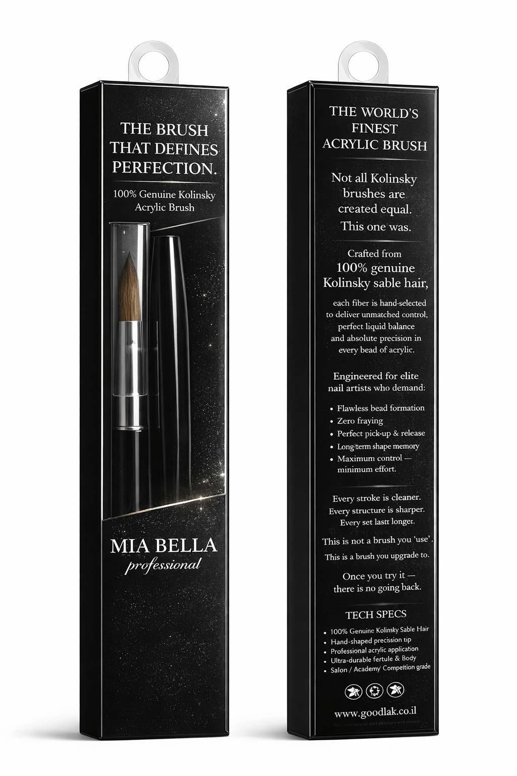 עשוי מ־100% שיער קולינסקי אמיתי, כאשר כל סיב נבחר בקפידה על מנת להעניק שליטה מושלמת בנוזל, איזון מדויק בין מונומר לאבקה ודיוק מוחלט בכל כדור אקריל.