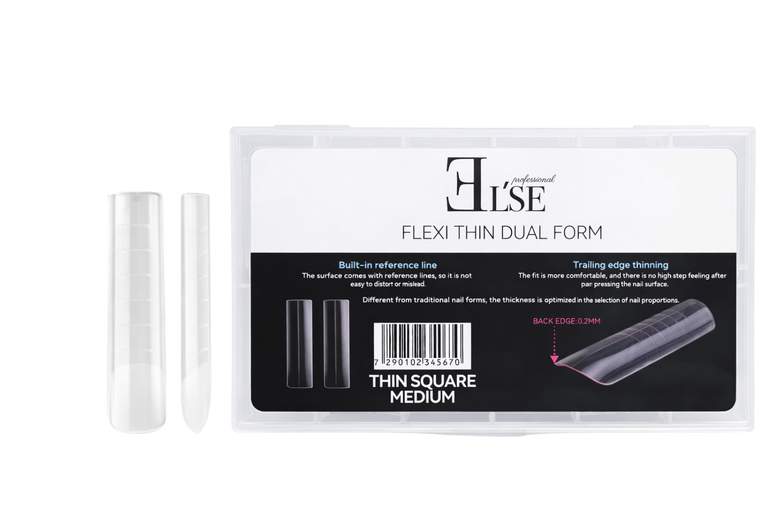 FLEXI THIN DUAL FORM – טיפס הפוך דקיק במיוחד עם סימון מובנה להנחה מדויקת ללא עיוות. מבנה מאוזן המאפשר ייבוש מלא ואחיד של החומר, שליטה גבוהה ודיוק מקסימלי בפרופורציות הציפורן.