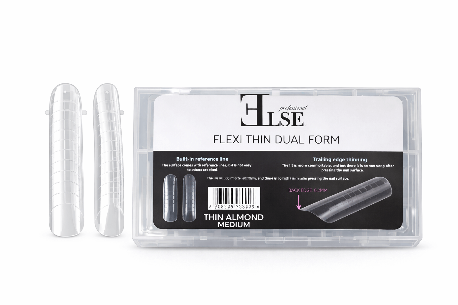 FLEXI THIN DUAL FORM – טיפס הפוך דקיק במיוחד עם סימון מובנה להנחה מדויקת ללא עיוות. מבנה מאוזן המאפשר ייבוש מלא ואחיד של החומר, שליטה גבוהה ודיוק מקסימלי בפרופורציות הציפורן.